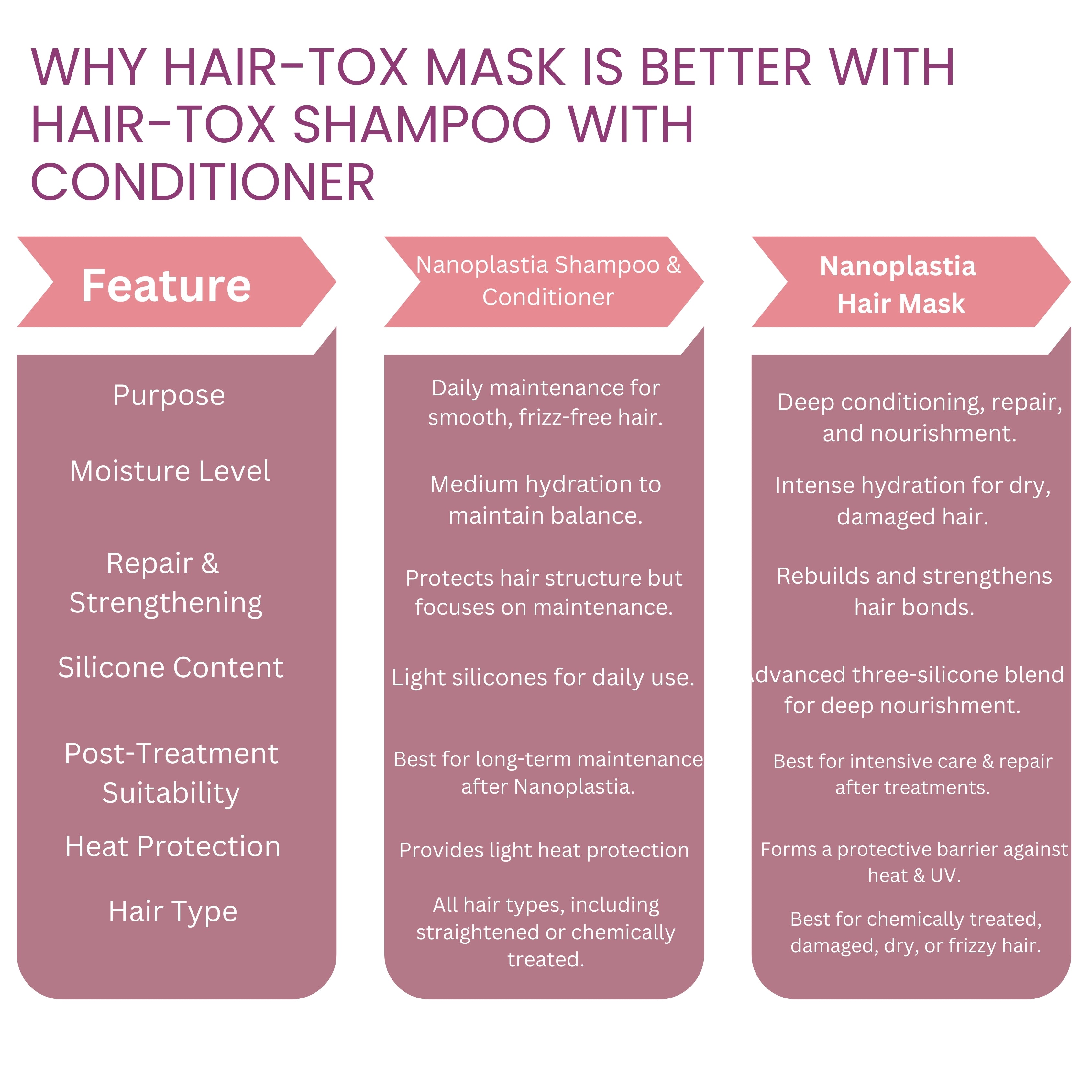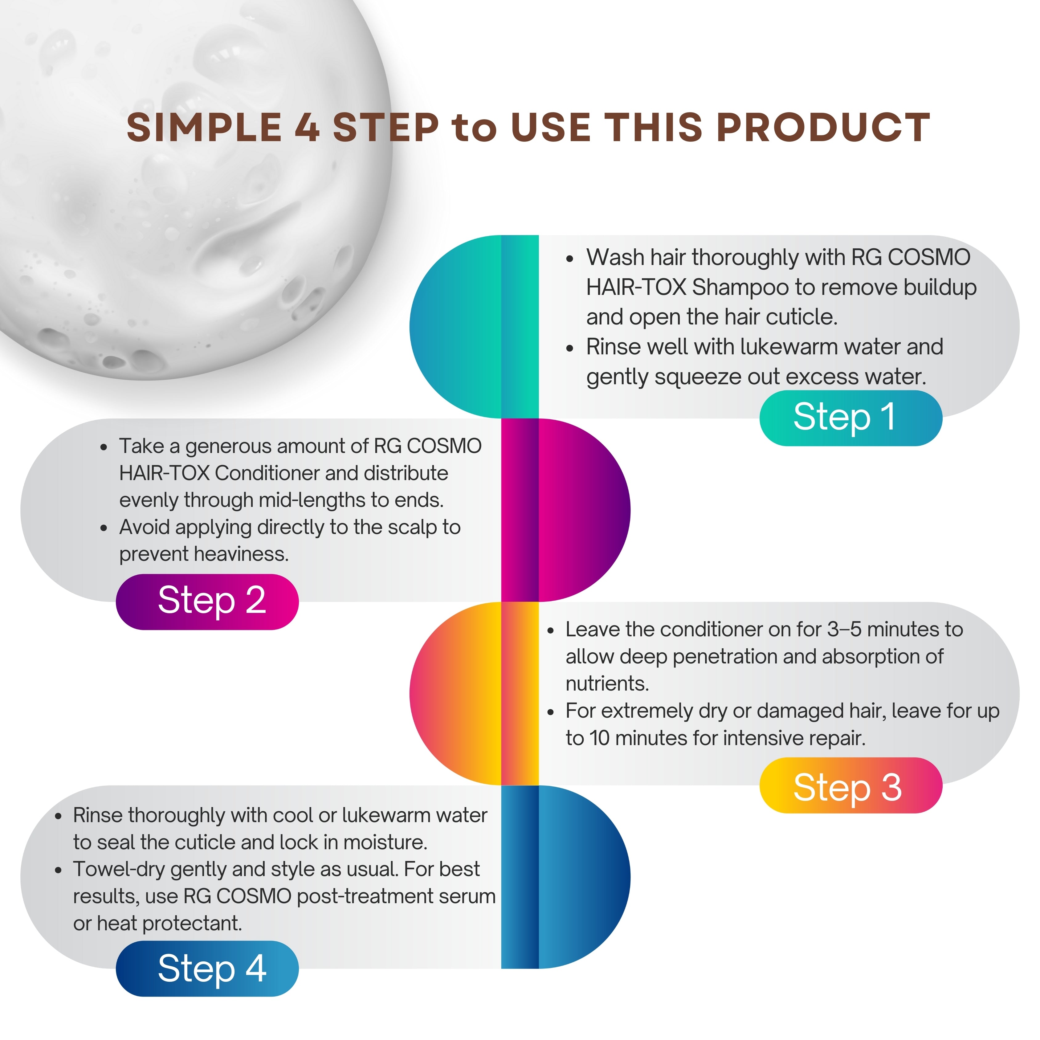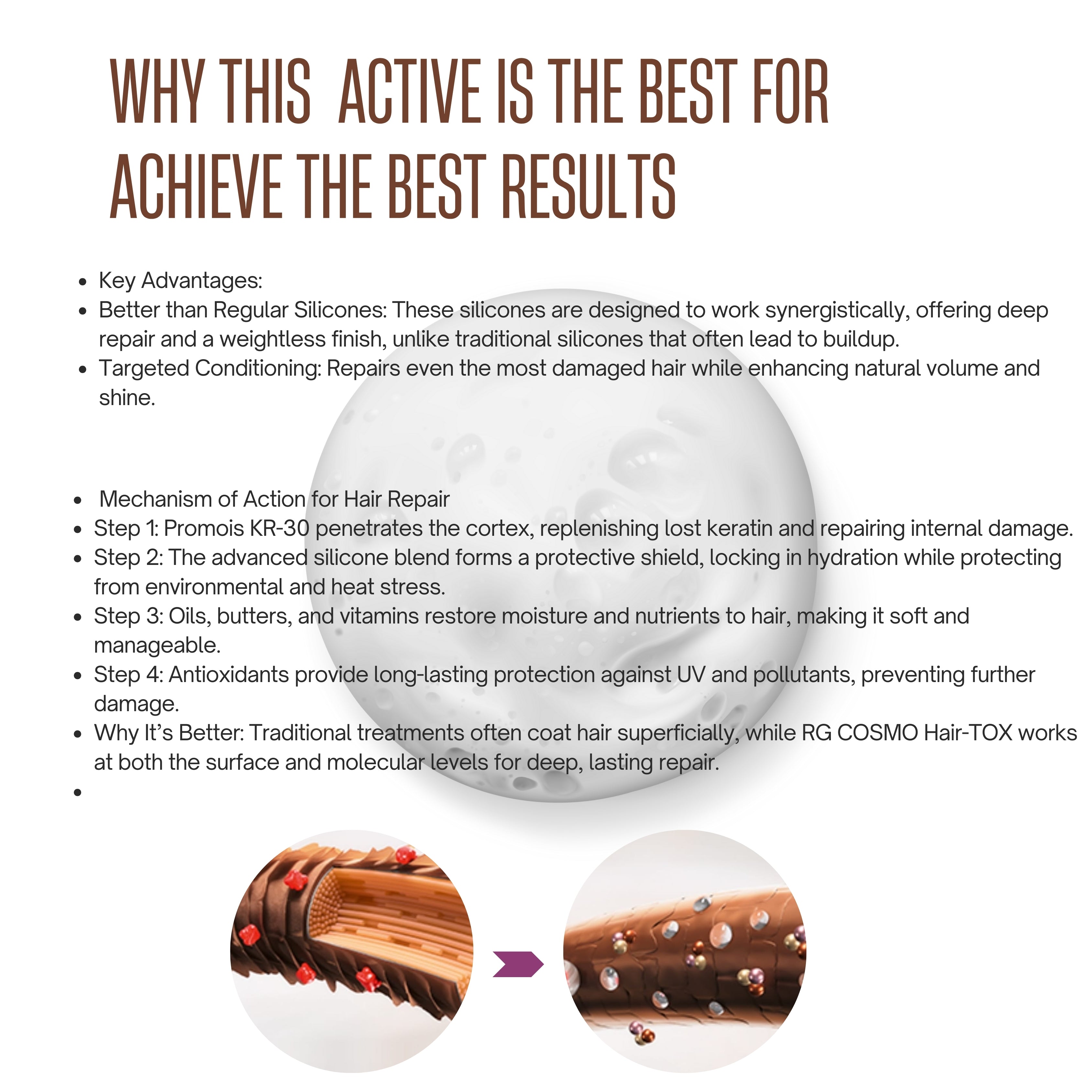 This professional hair treatment mask repairs and strengthens hair after a hair-tox treatment. Its sulphate-free formula nourishes hair at a molecular level, leaving it healthier and more manageable. Experience the benefits of strong, revitalized hair with RG Cosmo Professional Hair-Tox Post Care Treatment.