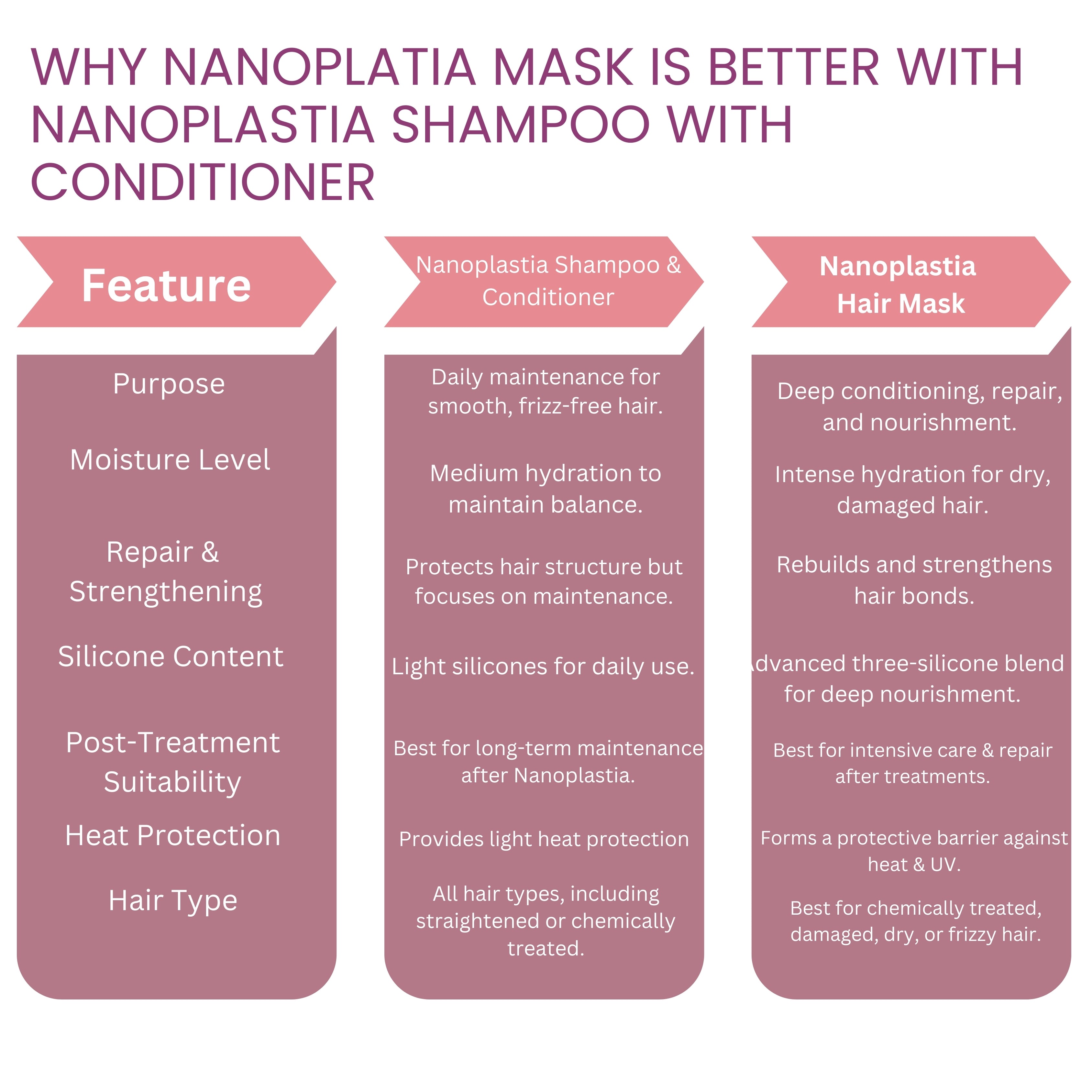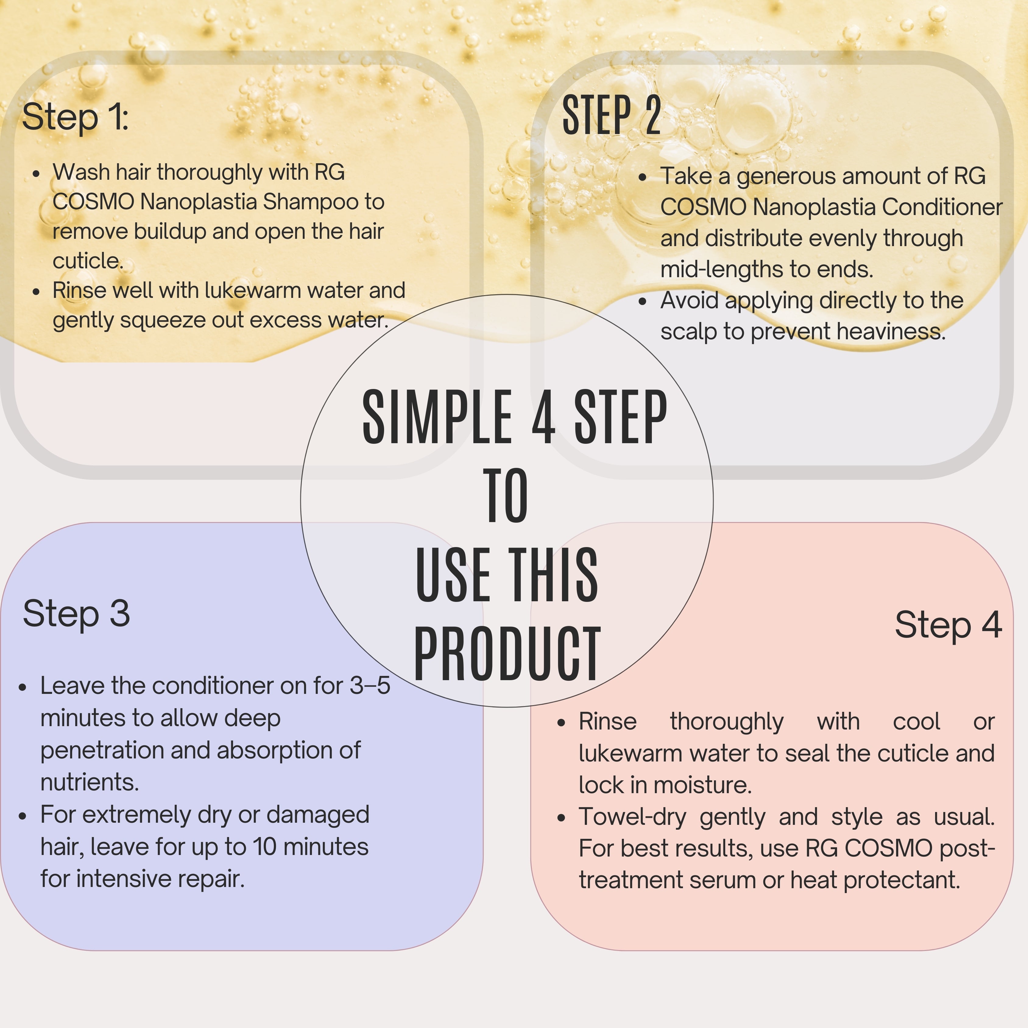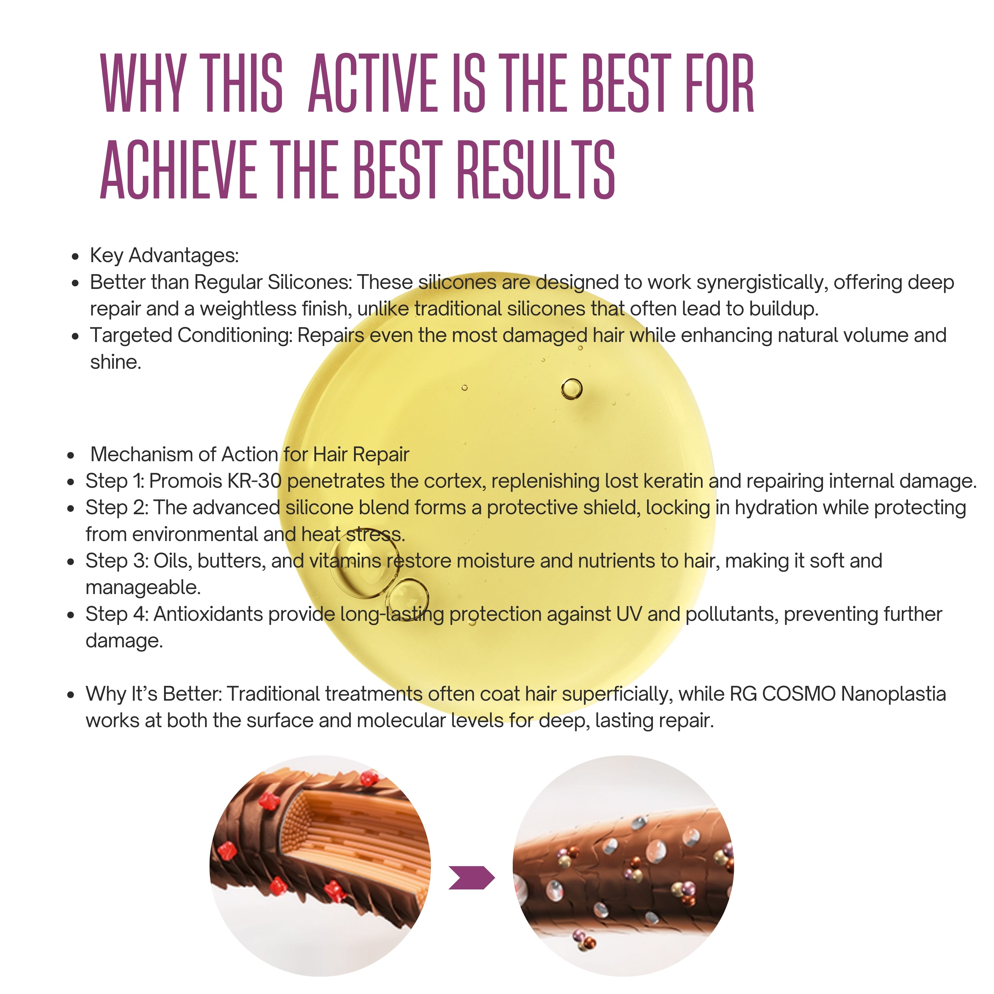 Repair and nourish your hair with RG Cosmo Professional Nanoplastia Post Treatment Sulphate-Free Hair Mask. This molecular repair mask is designed to restore damaged hair, leaving it healthy and strong. Give your hair the care it deserves with our specially formulated hair mask.